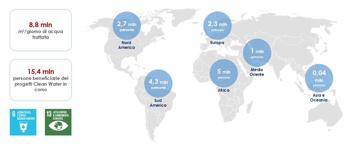 Anche attraverso gli impianti realizzati da , parte del Gruppo Webuild e leader mondiale nella dissalazione e trattamento delle acque, serviamo ogni giorno oltre 20 milioni di persone nel mondo producendo ogni giorno 8,8 milioni di metri cubi di acqua trattata. Sono oltre 15 milioni le persone che beneficeranno delle infrastrutture idriche che stiamo realizzando.