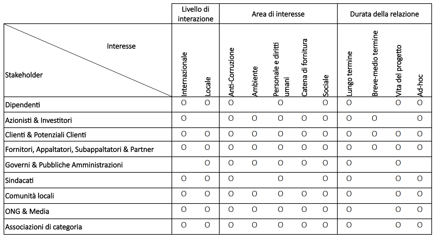 Riteniamo che correttezza e trasparenza delle relazioni con gli stakeholdersiano parte integrante dell’agire responsabile d’impresa. In ragione delle peculiarità del nostro business e della conduzione su scala internazionale delle nostre attività, gestiamo quotidianamente migliaia di interazioni con i nostri stakeholder. Al fine di adottare i più corretti canali di ascolto e cogliere tempestivamente le istanze dei nostri stakeholder, svolgiamo periodicamente una mappatura e un’analisi delle principali categorie di stakeholder, che tiene in considerazione il livello, la frequenza e la durata dell’interazione, le tematiche di maggior interesse e i potenziali ambiti di impatto, l’influenza potenziale sui processi decisionali, ecc.