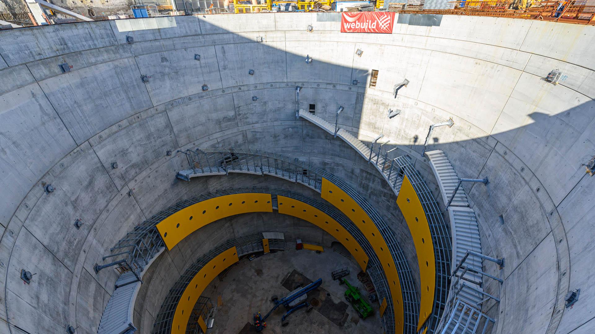 Il piano di sbarco degli ascensori è collegato da tre by-pass alle due gallerie di stazione, ciascuna lunga 110 metri e di 8,9 metri di diametro.
